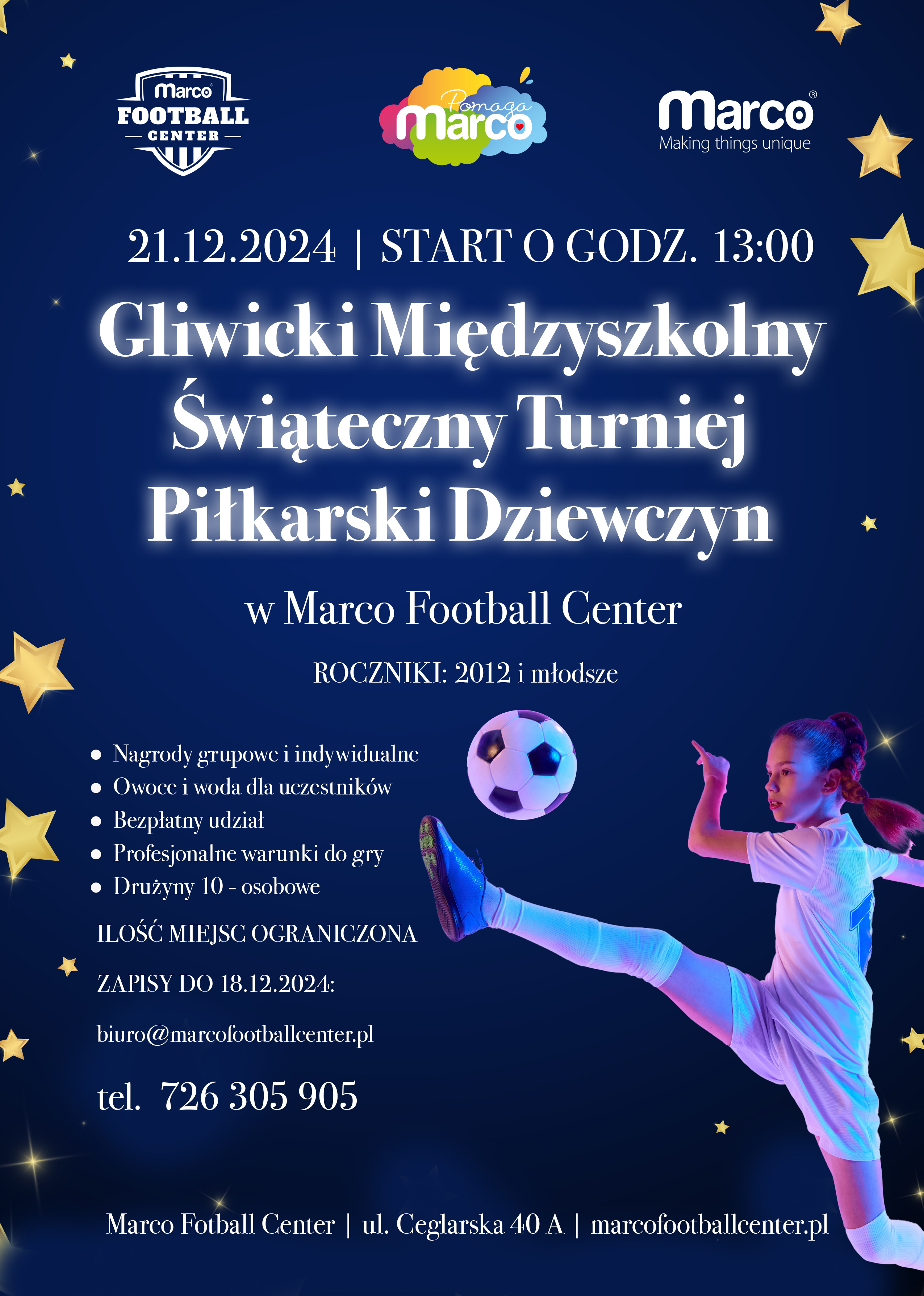 Fundacja MarcoPomaga zaprasza na Gliwicki Międzyszkolny Świąteczny Turniej Piłkarski Dziewczyn