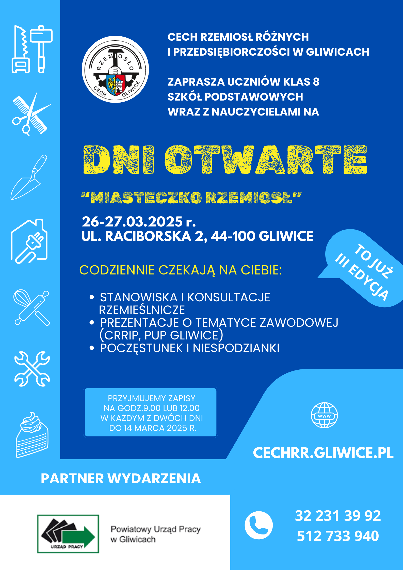 Zapraszamy do udziału w III edycji Miasteczka Rzemiosł! Opublikowane: 14.02.2025 / Sekcja: Oświata https://www.cechrr.gliwice.pl/index.php?option=com_content&view=article&id=426:zaproszenie-do-udzialu-w-iii-edycji-miasteczka-rzemiosl&catid=35&Itemid=177