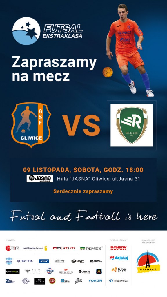9 listopada o godz. 18.00 w hali sportowej przy ul. Jasnej 31 rozpocznie się mecz VIII kolejki Futsal Ekstraklasy. GSF Gliwice podejmie Rekord Bielsko-Białą. Zachęcamy do kibicowania!